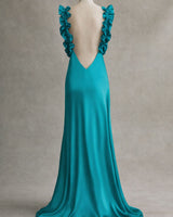 Long silk dress with silk lining* (to prevent anything from showing), cut on the bias, which gives the dress a spectacular drape and adapts very well to the body without ever being tight. It falls in an "A" shape.