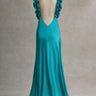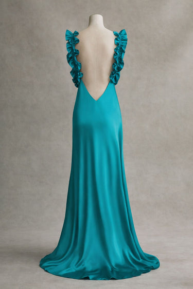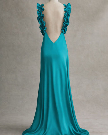 It features a V-neckline and a V-back with playful ruffled straps that add a beautiful, feminine touch.
