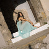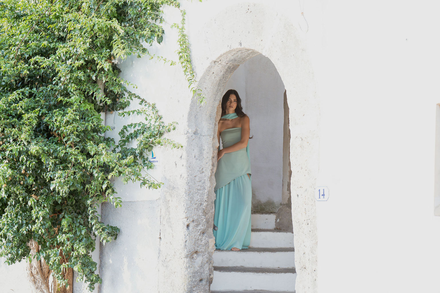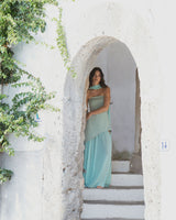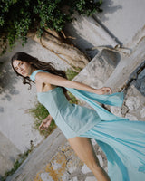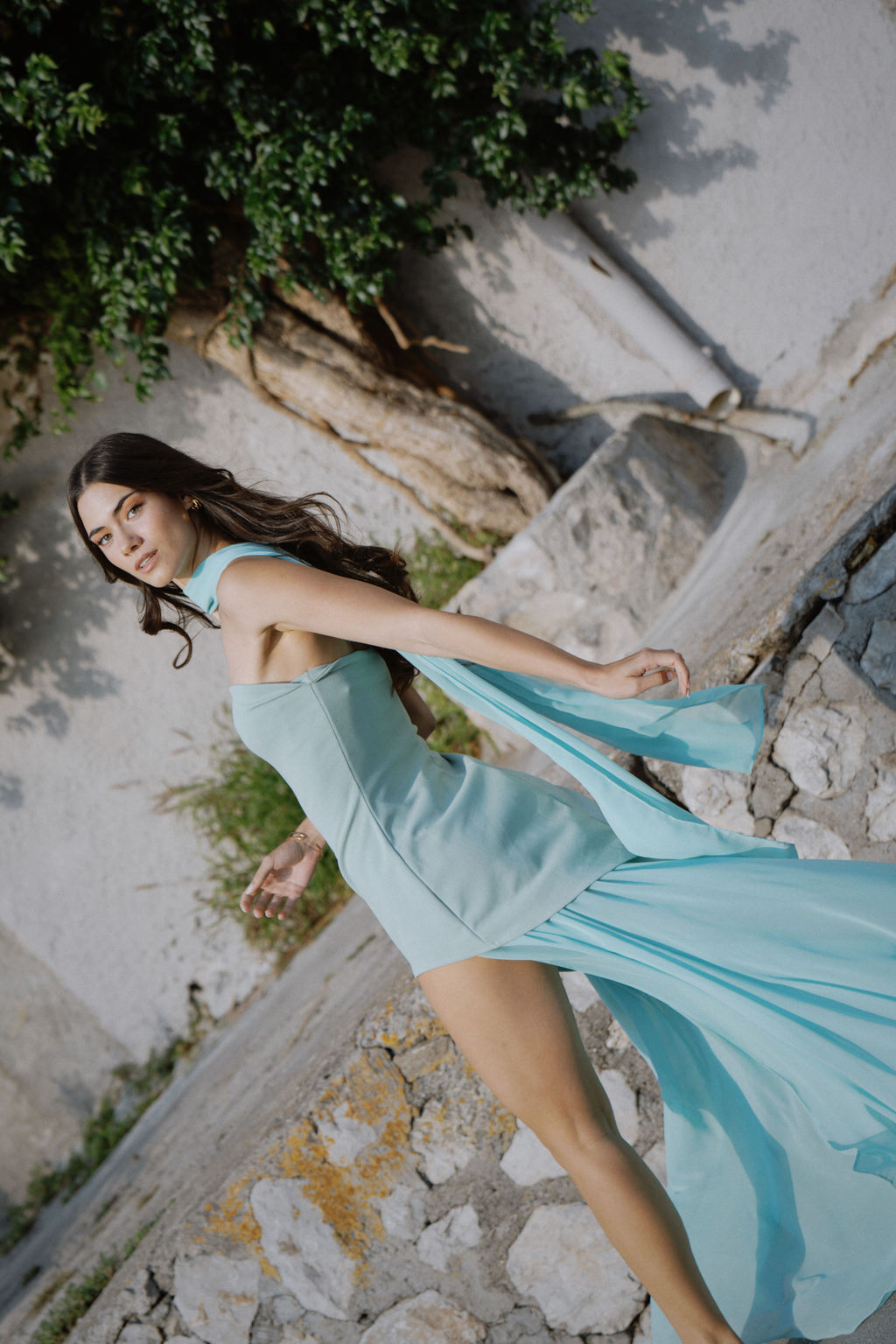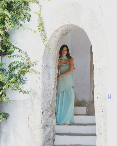 A super comfortable strapless dress made of mint crepe and lycra, featuring a sheer chiffon layer in the lower part to play with the duality of light and shadow.