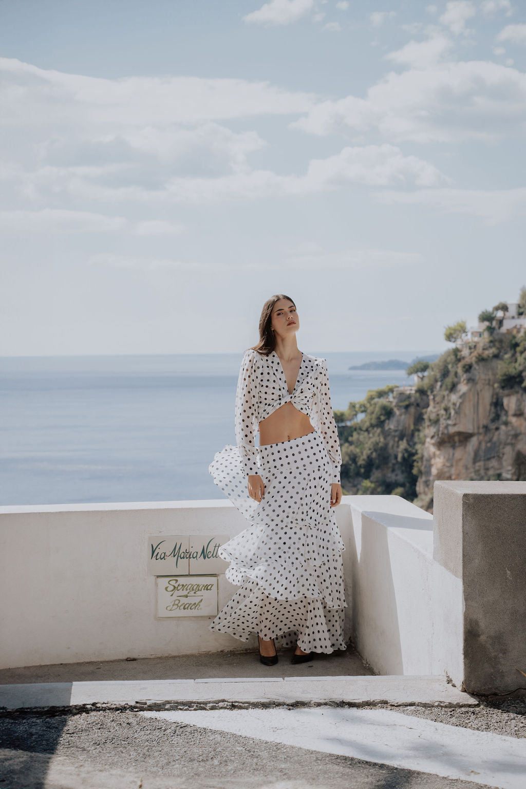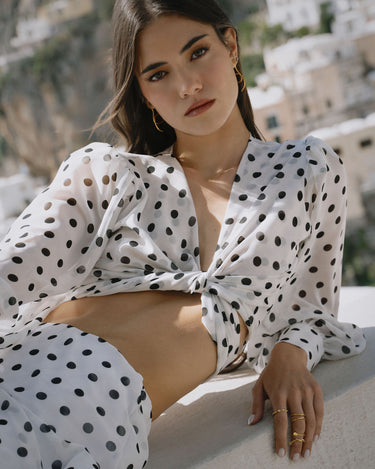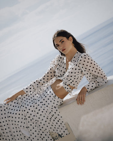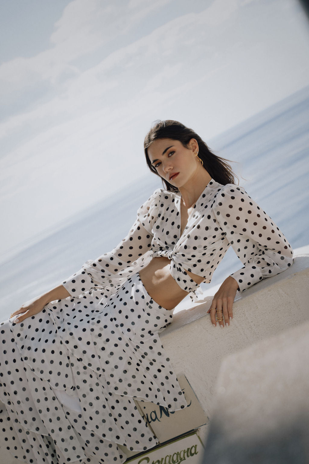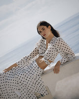 Two-piece set made of light chiffon with a playful black polka dot print over an ivory base.
