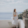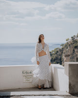 The top features long sleeves with buttons on the sleeves, an adjustable front detail, and a deep neckline that adds movement and softness to the silhouette. The matching skirt falls in cascading ruffles, creating a fluid and romantic effect as you walk.