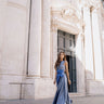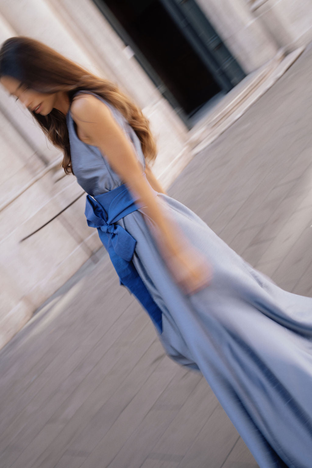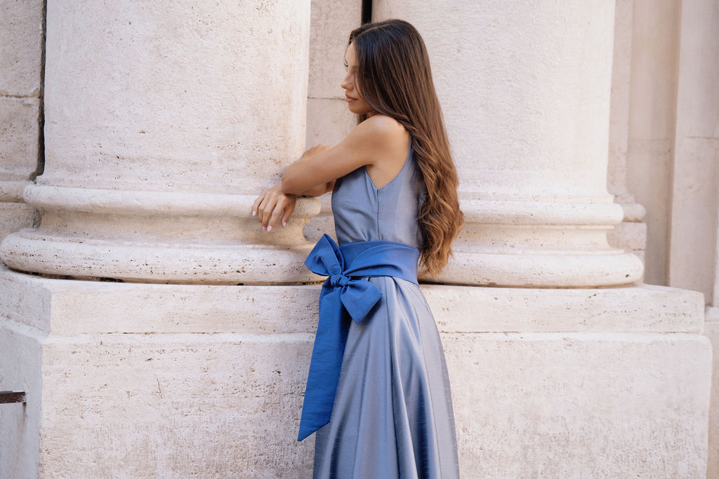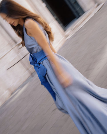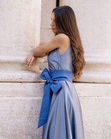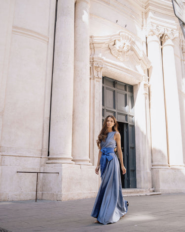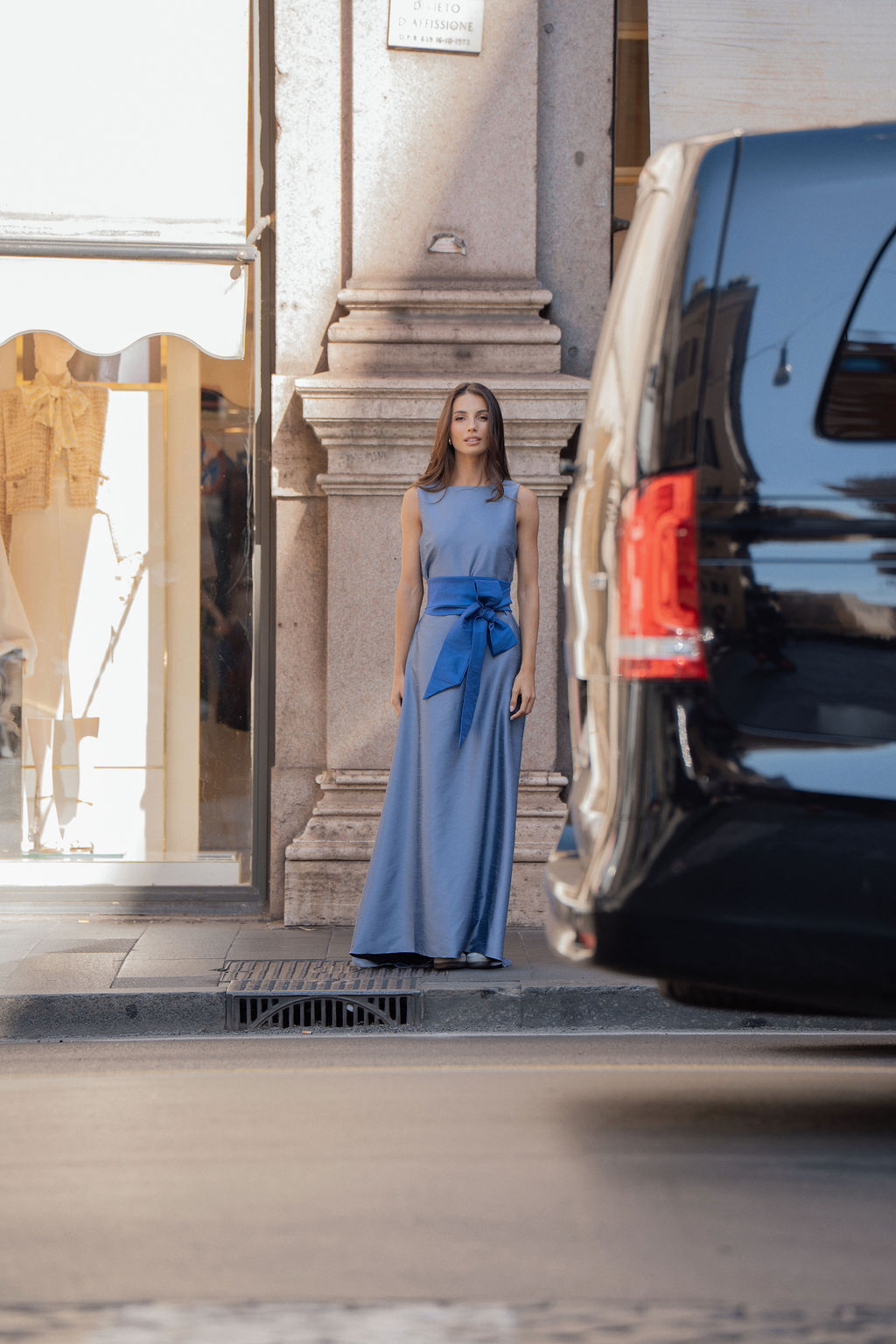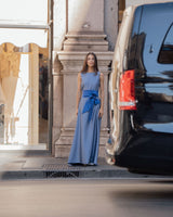 This sleeveless maxi dress is cut with a clean, structured bodice that flows into a long skirt, cinched at the waist with an oversized bow belt in tonal blue. The contrast of simplicity and statement creates an effortlessly graceful silhouette.