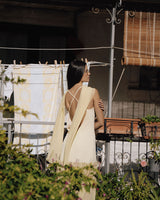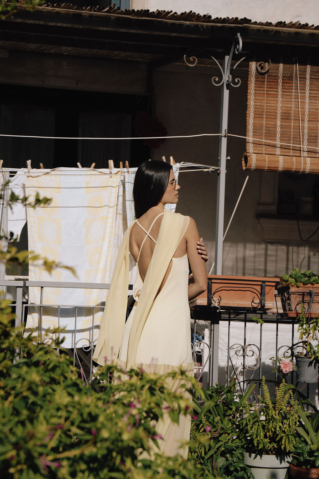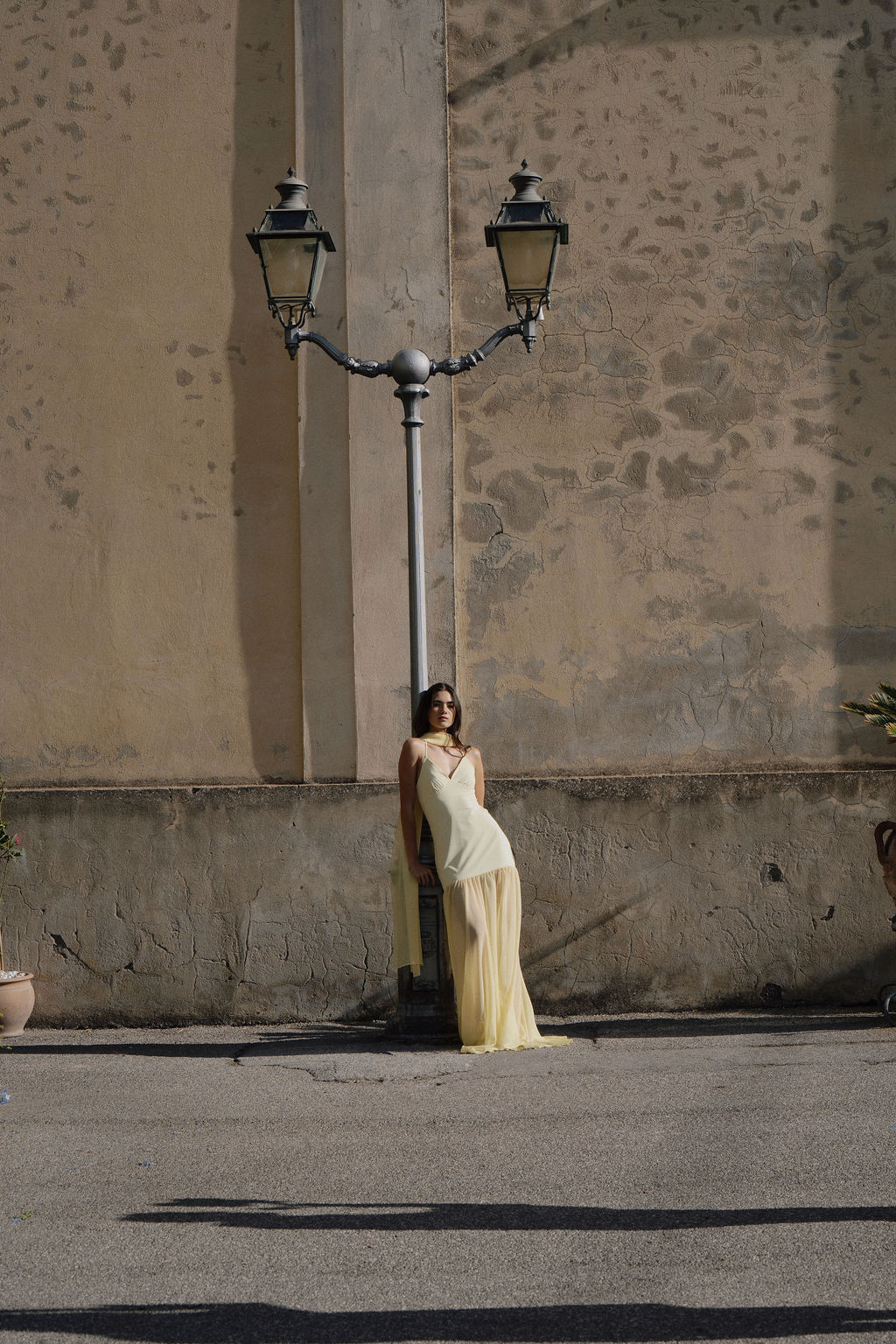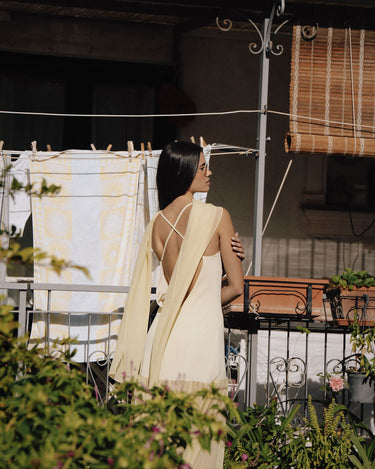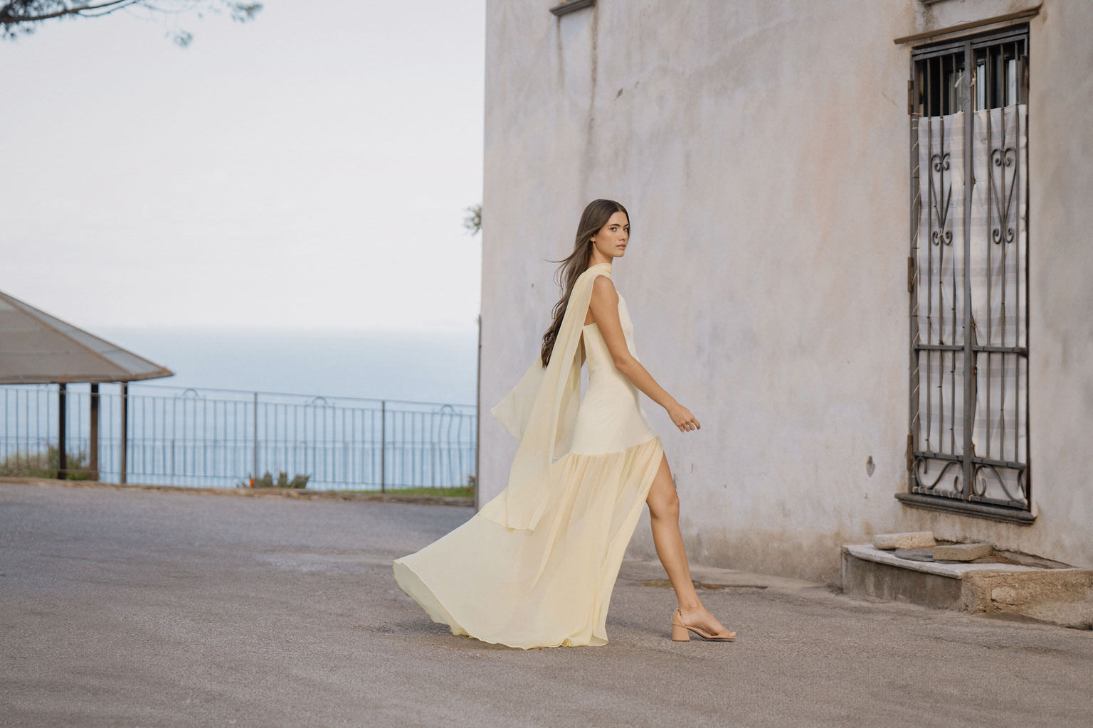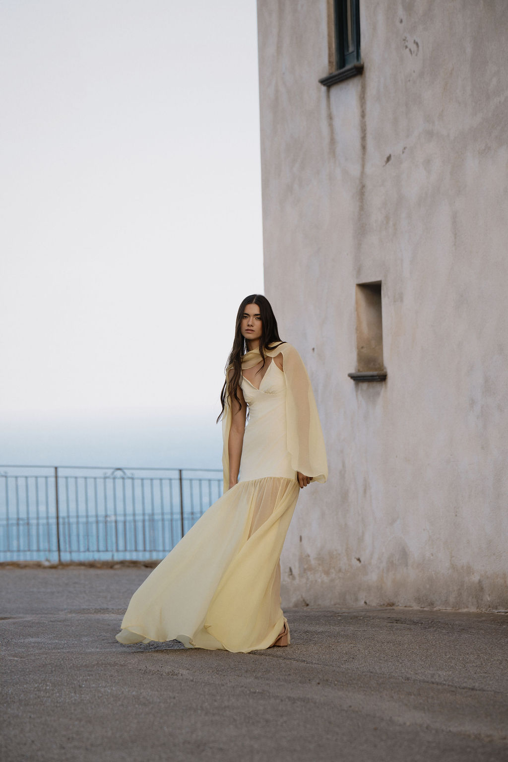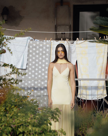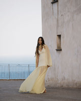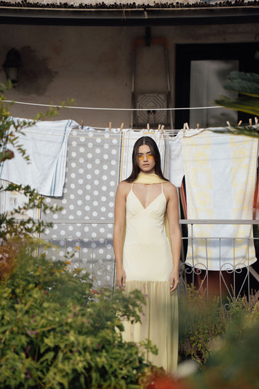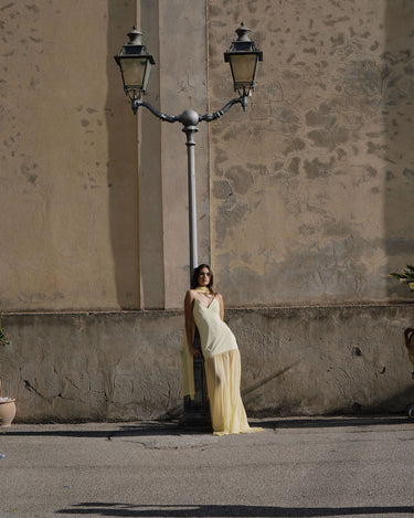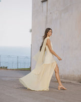 A super flattering dress with thin straps, made of soft yellow crepe, featuring a sheer chiffon layer in the lower part to add movement and lightness.
