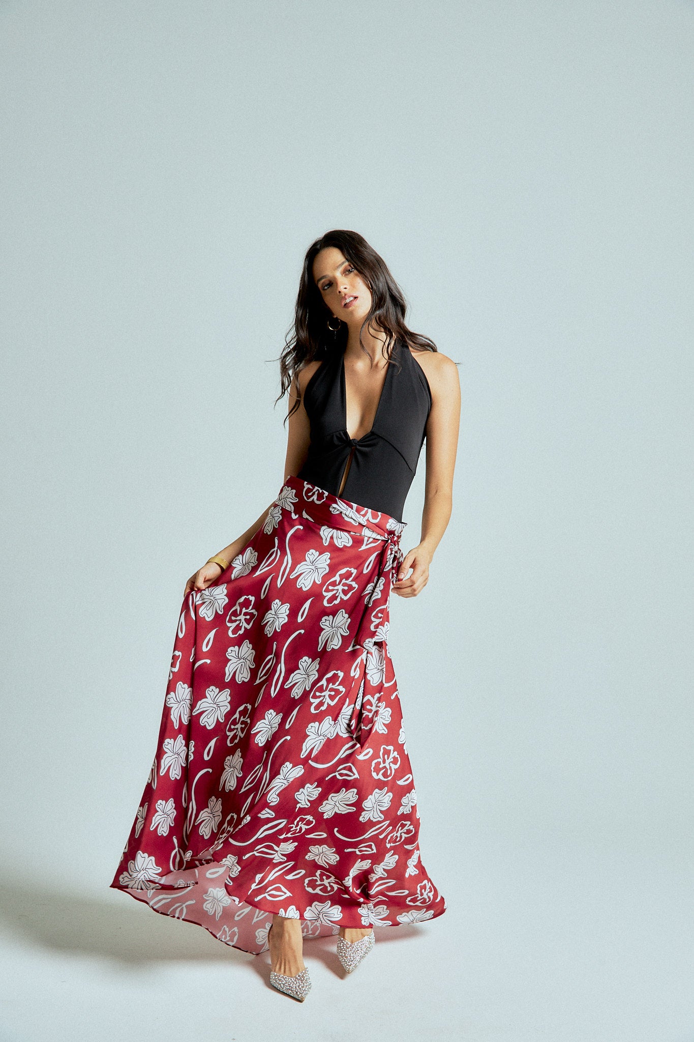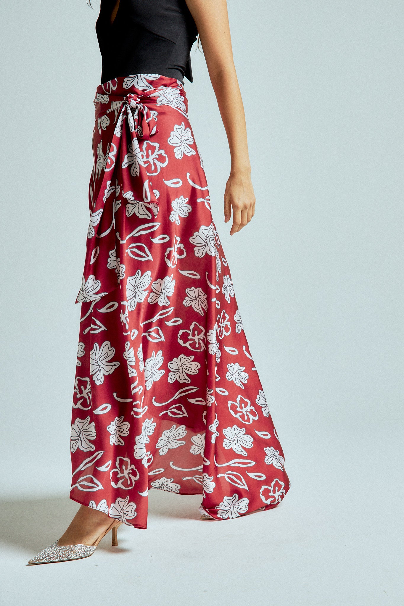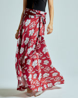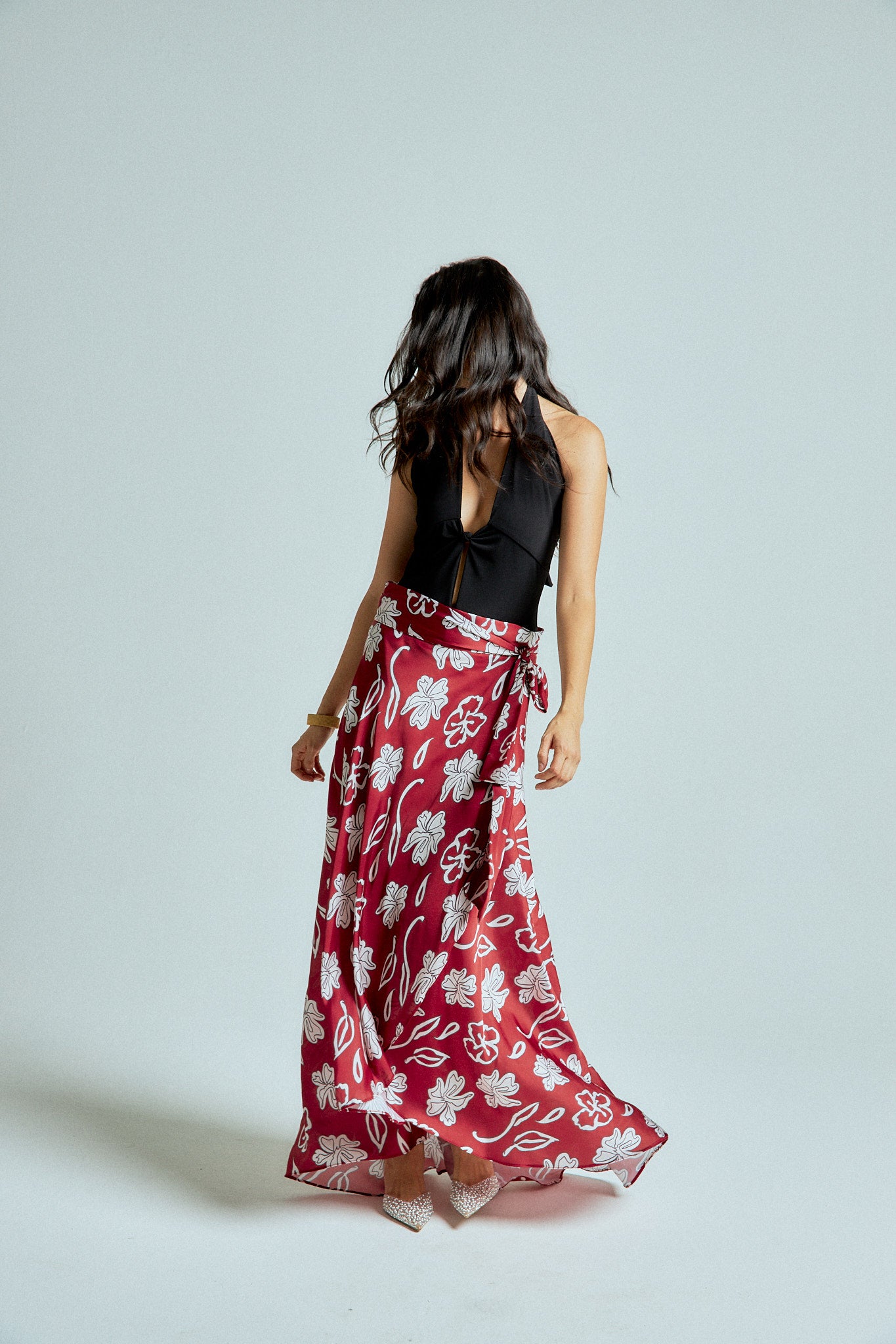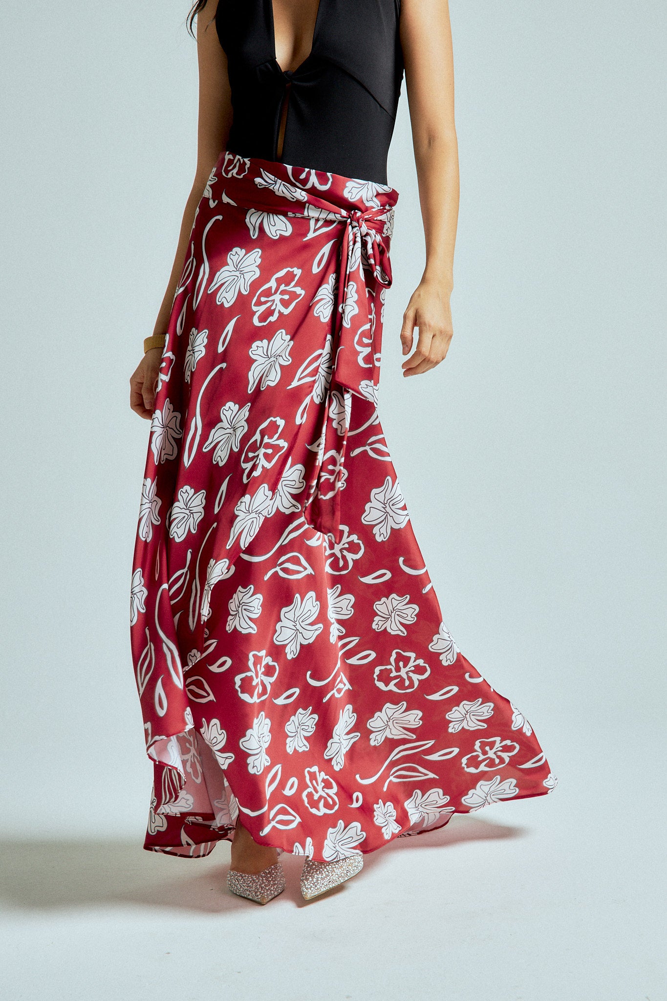 An eye-catching full-length wrap skirt in our almendra print, crafted in our signature polyester silk for fluid drape and radiant motion. Designed as a true wrap silhouette, it adjusts at the waist to comfortably fit from XS to XL, making it as versatile as it is striking. The flowing shape enhances every step, while the exclusive in-house print brings personality, color, and confidence to your look.
