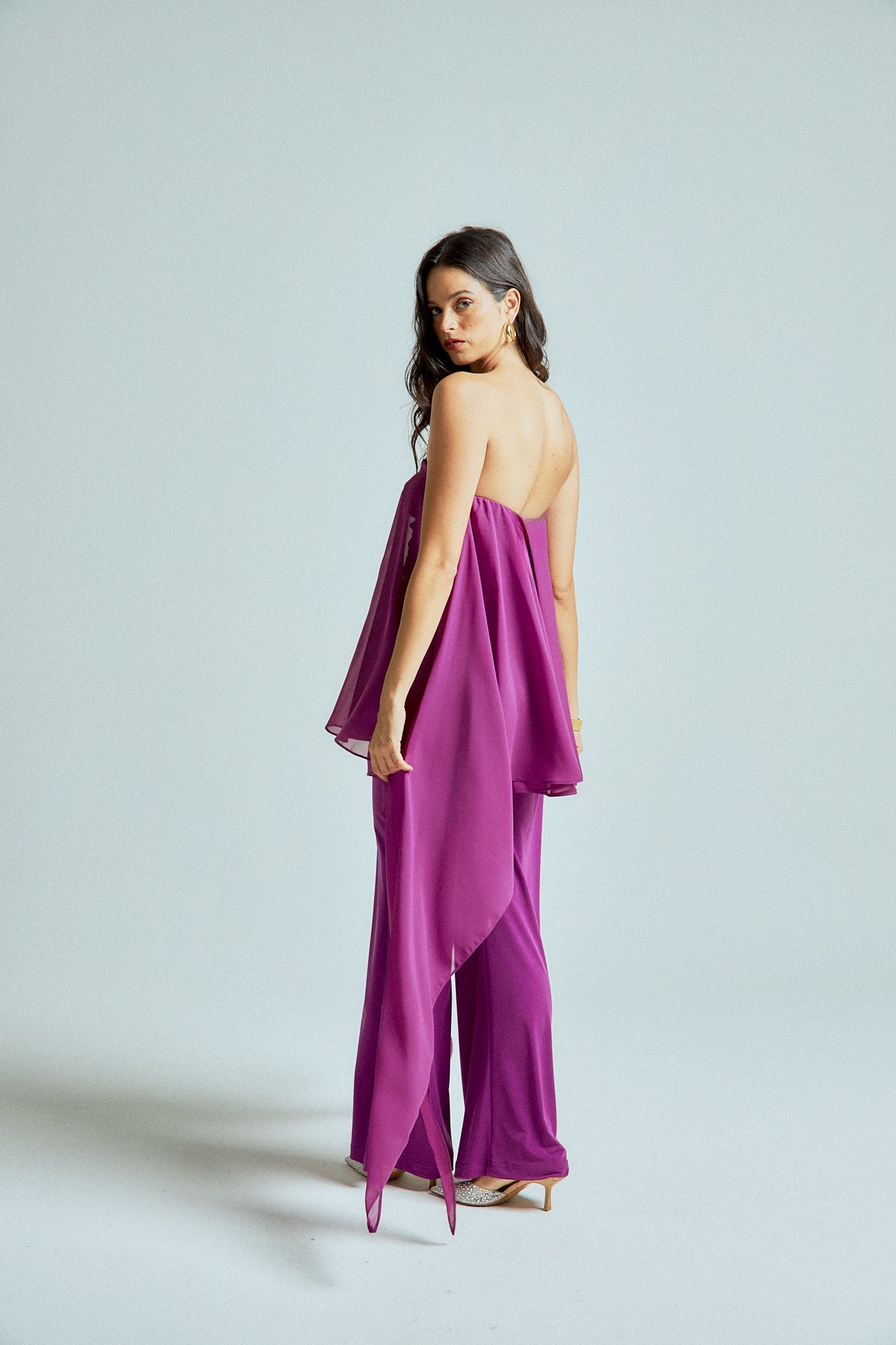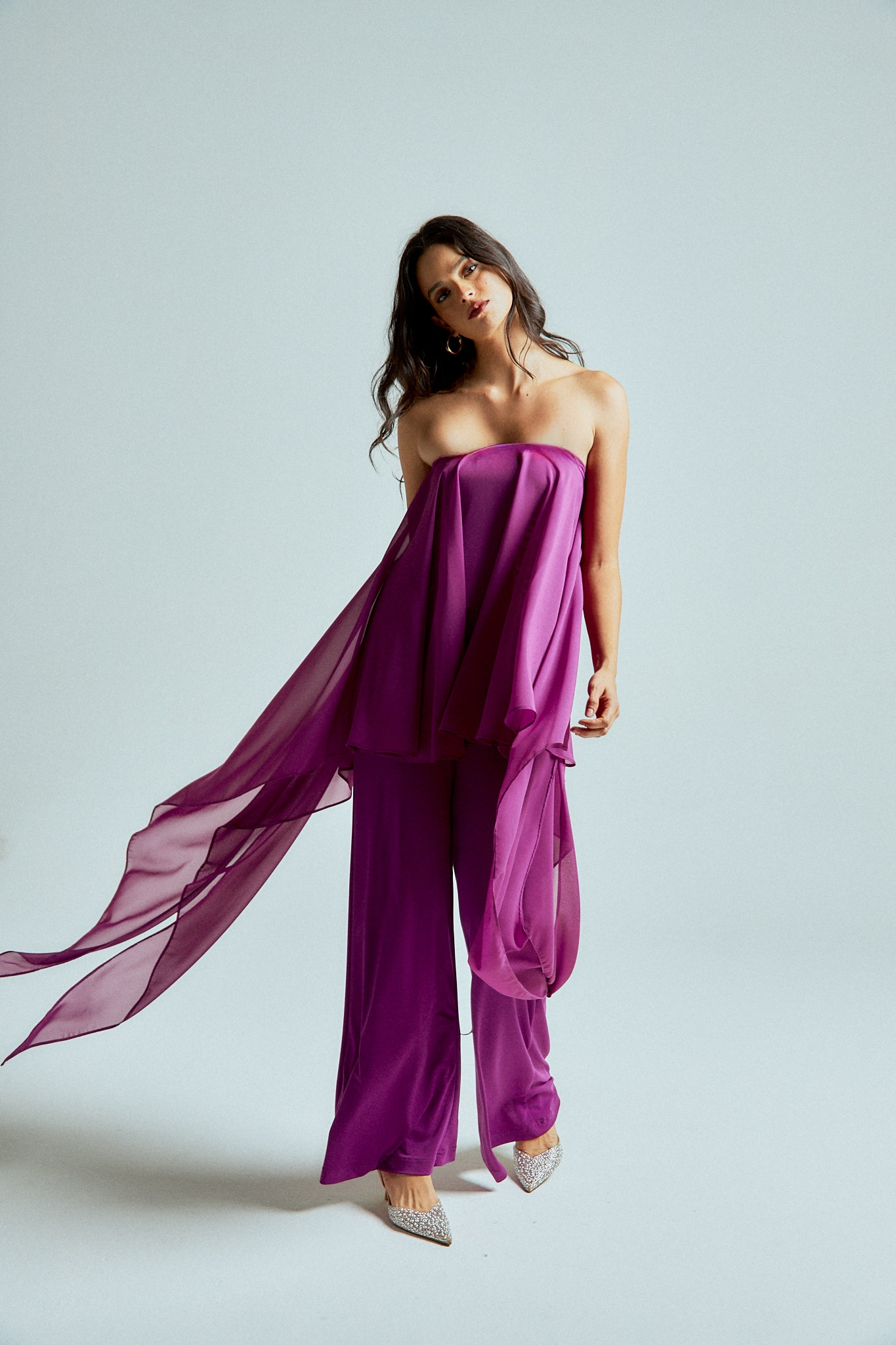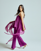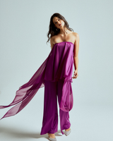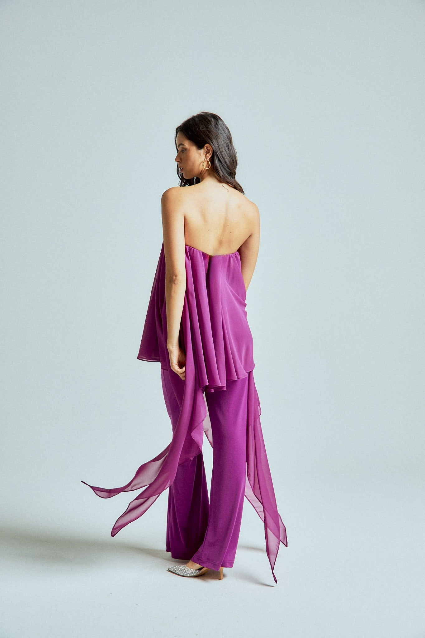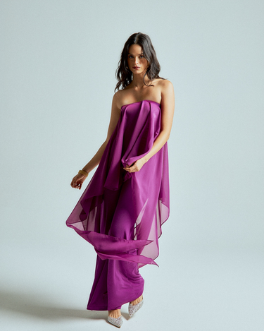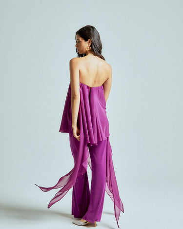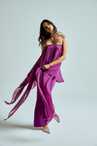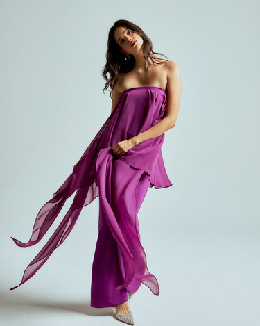 The strapless chiffon top features soft, fluid layers that flow delicately with every step, creating lightness and dimension. It is paired with straight-leg stretch lycra pants that sculpt and elongate the silhouette while offering effortless comfort.
