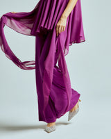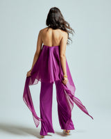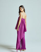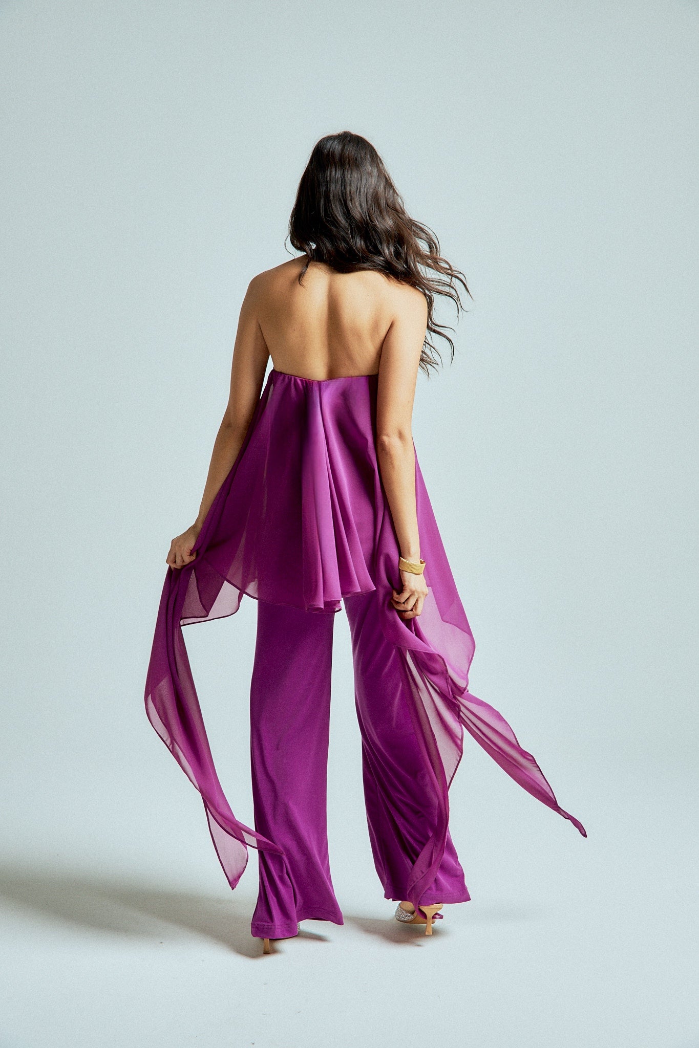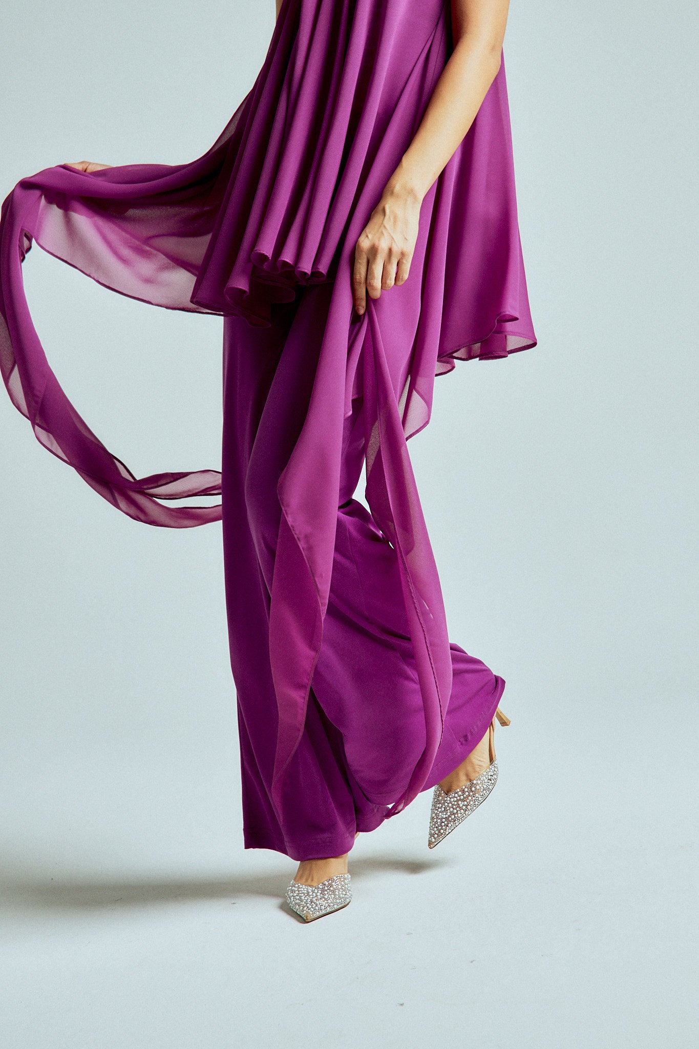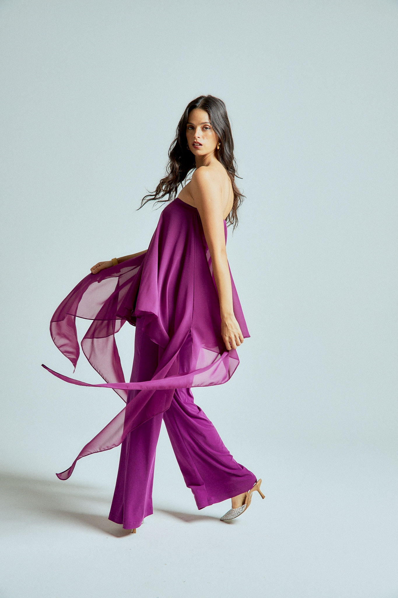 The strapless chiffon top features soft, fluid layers that flow delicately with every step, creating lightness and dimension. It is paired with straight-leg stretch lycra pants that sculpt and elongate the silhouette while offering effortless comfort.