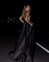 Vestido largo de satén en color negro intenso, cortado al bies para lograr una caída impresionante y un ajuste fluido que se adapta al cuerpo.