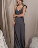 Vestido largo de seda con forro de seda* (para evitar que se vea), cortado al bies, lo que le da una caída espectacular y se adapta muy bien al cuerpo sin apretar. Tiene forma de "A".