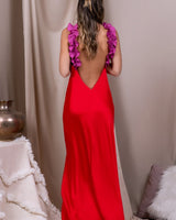 Vestido largo de seda con forro de seda* (para evitar que se vea), cortado al bies, lo que le da una caída espectacular y se adapta muy bien al cuerpo sin apretar. Tiene forma de "A".