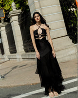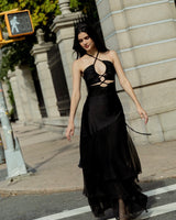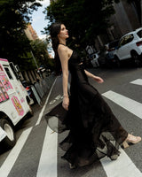 La silueta define la cintura y alarga las piernas gracias a sus detalles de gasa en capas, inspirados en las amapolas silvestres y el elegante movimiento de sus pétalos en el viento.