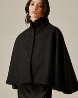 Esta capa de lana negra, hecha a mano, es una pieza destacada diseñada para realzar cualquier look con una sofisticación natural. Hecha en Chile con lana suave y cálida, su silueta estructurada y fluida cae con gracia sobre los hombros, creando líneas limpias y una presencia impactante.