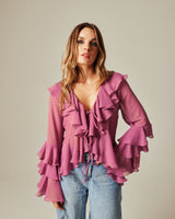 Esta blusa de gasa rosa translúcida envuelve el cuerpo con suavidad y movimiento. La superposición de capas en el busto y los volantes alegres en las mangas crean profundidad y una textura delicada.