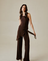 Estos pantalones de licra en tono chocolate presentan una silueta fluida y un ajuste cómodo, realzados por una delicada capa de gasa que se cruza y se ata suavemente a la cadera. El efecto cruzado aporta movimiento y un toque de sofisticación, realzando la figura con una frescura natural.