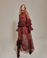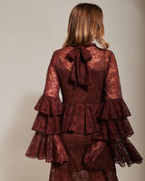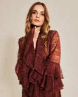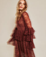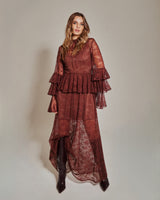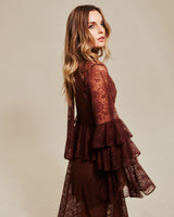 Este vestido de encaje color chocolate celebra la delicadeza del movimiento. Con mangas a capas, suaves volantes y un sutil detalle en la cadera que estiliza la silueta, está diseñado para destacar, sin esfuerzo.
