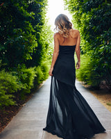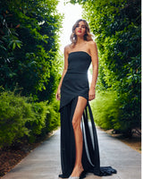 Un vestido strapless súper cómodo confeccionado en crepe y lycra negra, que presenta una capa de gasa transparente en la parte inferior para jugar con la dualidad de luces y sombras.