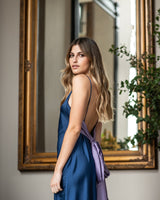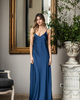 Vestido largo de seda con forro de seda* (para evitar que se vean las líneas), cortado al bies, lo que le da una caída espectacular y se adapta a la perfección al cuerpo sin apretar. Tiene forma de "A".