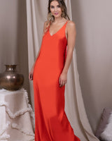 Vestido largo de seda con forro de seda* (para evitar que se vean las líneas), cortado al bies, lo que le da una caída espectacular y se adapta a la perfección al cuerpo sin apretar. Tiene forma de "A" y una abertura lateral.