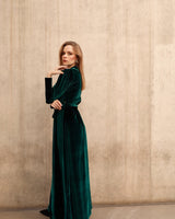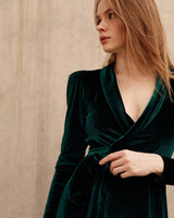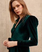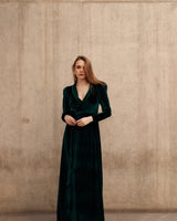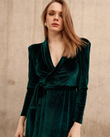 Vestido cruzado de terciopelo verde petróleo con manga larga.
