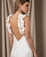 Vestido de novia con volantes y color mantequilla