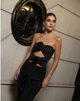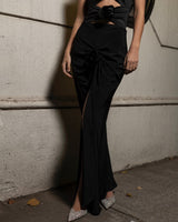 Es largo, diseñado para una elegante caída por detrás, pero cómodo para caminar gracias a la abertura frontal. Incorpora una pieza interior de tela que crea el efecto de una falda más corta, garantizando discreción.