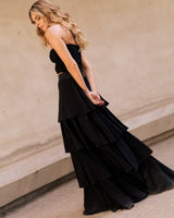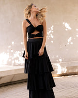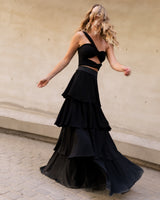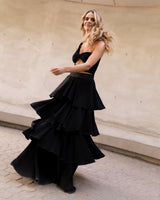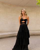 Falda negra con múltiples capas de crepé ligero con volantes, que ofrece mucho movimiento para que te veas tan encantadora como te sientes al usarla.