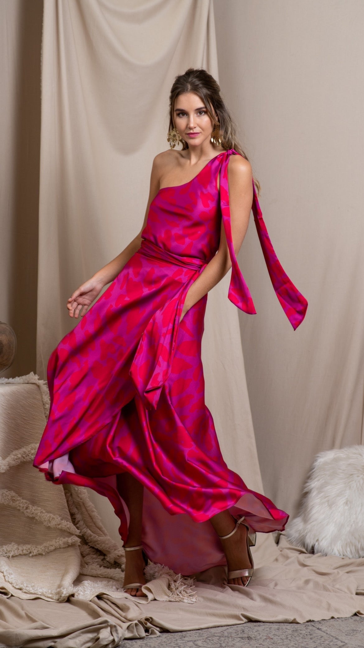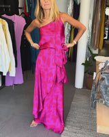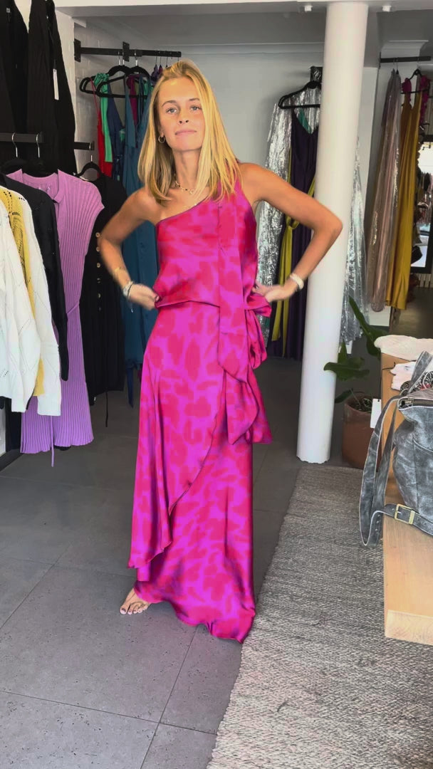 This one-shoulder blouse and flowing wrap skirt with an animal print is crafted in our signature polyester silk and designed to move with you. Both pieces feature adjustable ties for a custom, flattering fit.