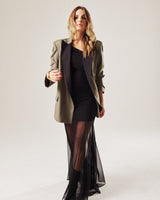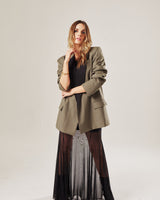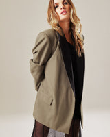 A must-own piece with understated drama. The Cocó Blazer plays on contrast—an oversized black lapel rests boldly against a warm, structured olive base. Featuring sharp shoulders, a relaxed silhouette, and a flap pocket, it instantly elevates your look while keeping an effortless edge.