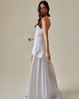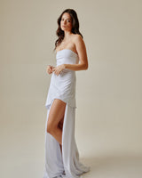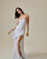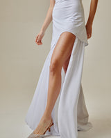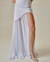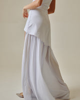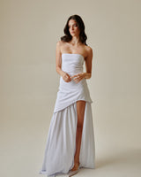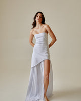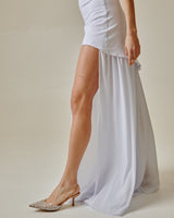 A super comfortable strapless dress made of white crepe and lycra, featuring a sheer chiffon layer in the lower part to play with the duality of light and shadow.