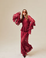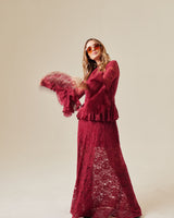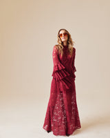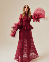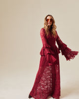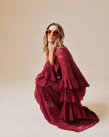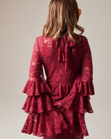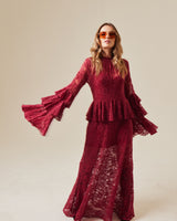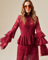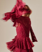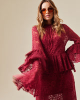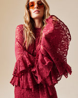 This cherry lace dress celebrates delicate movement. With layered sleeves, soft ruffles, and a gentle hip detail that shapes the silhouette, it's designed to highlight—without trying.